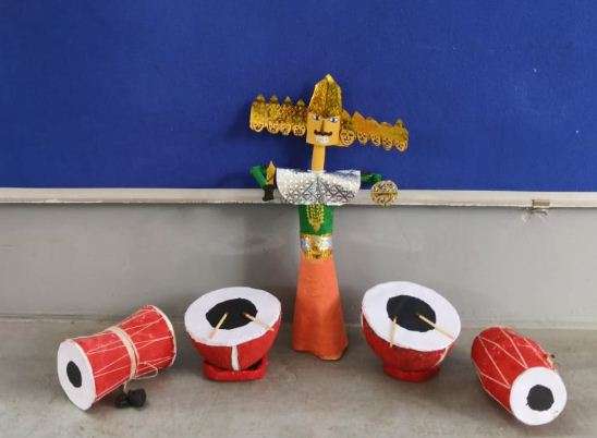 Dasara doll and musical instruments made using coconut shells, paper napkin and cardboard sheet by Hitesh Kumar of class 5A.